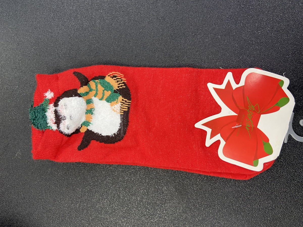 CALCETINES ROJOS CON PINGÜINO CON GORRO VERDE “3D” $45