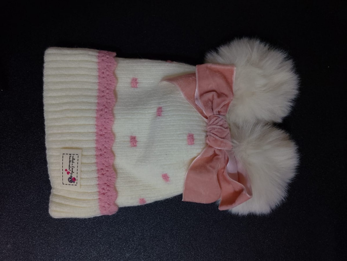 GORRO PARA NIÑA TEJIDO, CON DOS BOLITAS POMPOSAS CON UN MOÑO DE TERCIO PELO KOPO KIDS$245
