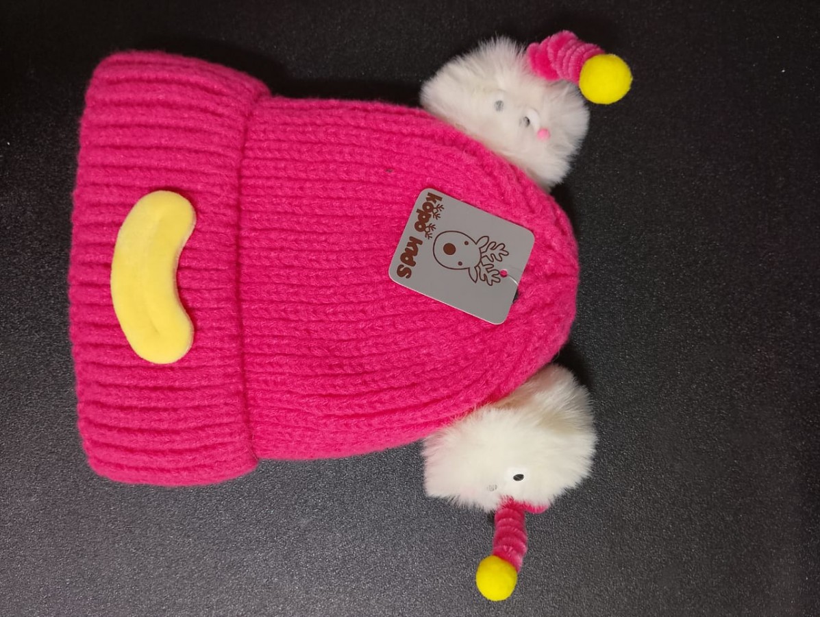 GORRO PARA NIÑA TIPO TEJIDO CON UNA BOCA, DOS BOLITAS POMPOSAS CON OJOS Y COTONETES KOPO KIDS$199