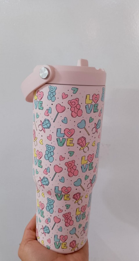 TERMO ROSA CON OSOS Y DULCES CON POPOTE TRANSPARENTE “HYDRAPEAK” $580